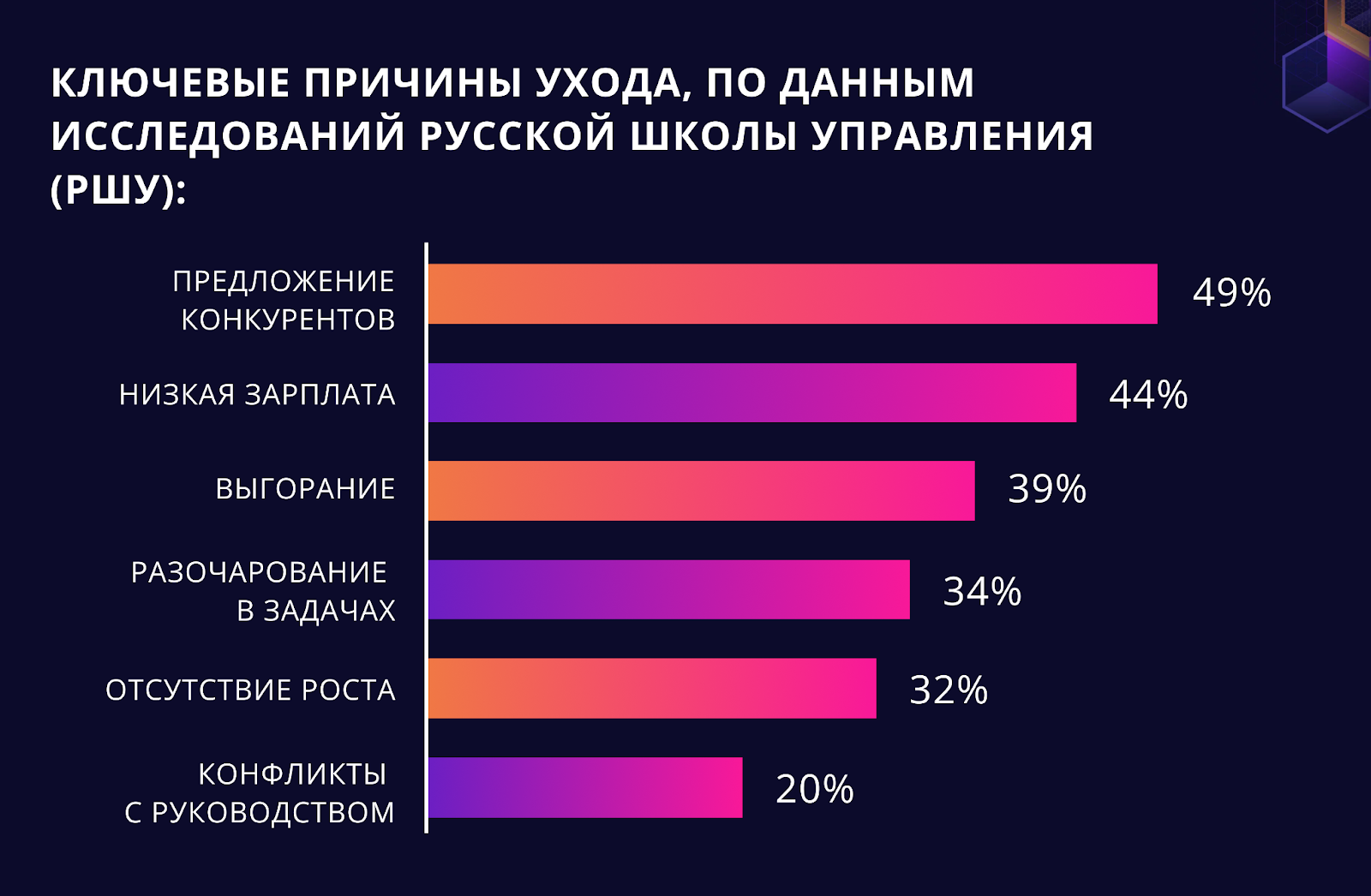- Перегрузка и выгорание. Не зря 39% увольняются именно по этой причине. Когда сотрудник тащит работу за троих, а компенсации нет, любой оффер с адекватной нагрузкой покажется спасением.