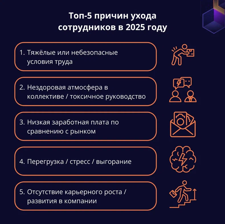 - Exit-интервью — разговор с теми, кто уходит, помогает выявить системные ошибки: перегруз, отсутствие карьерных перспектив, неэффективный менеджмент.